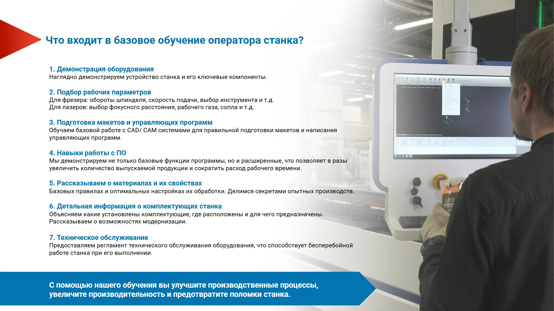 Существует два основных пути подготовки оператора ЧПУ: в колледже (техникуме) или на курсах. Компания LASERCUT предоставляет не только оборудование, но и обучение персонала на станках с ЧПУ.