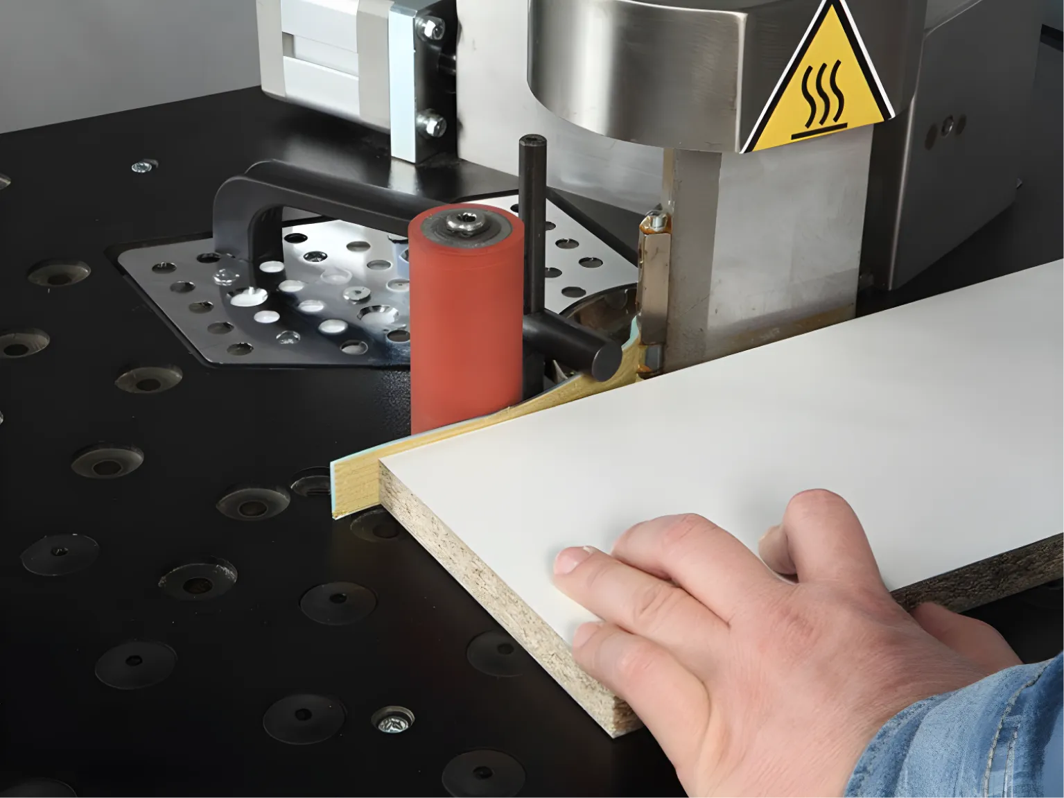 Это сердце кромкооблицовочного станка. Там клей нагревается, чтобы быть нанесенным на кромку. Способ нагрева может быть разным: под действием промышленного фена, инфракрасной лампы или лазера.