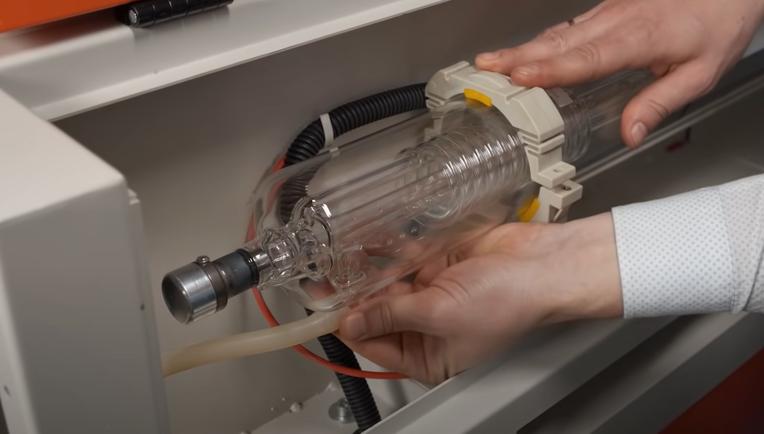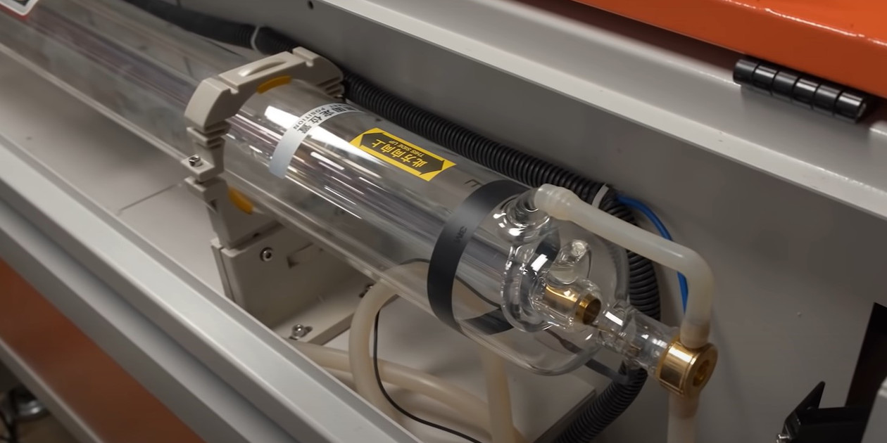 Лазерная трубка — это основной элемент станка. В нем происходит индуцирование лазерного луча. Система зеркал обеспечивает его попадание в лазерную головку, а затем при помощи линзы осуществляется его фокусирование и выход из сопла.
