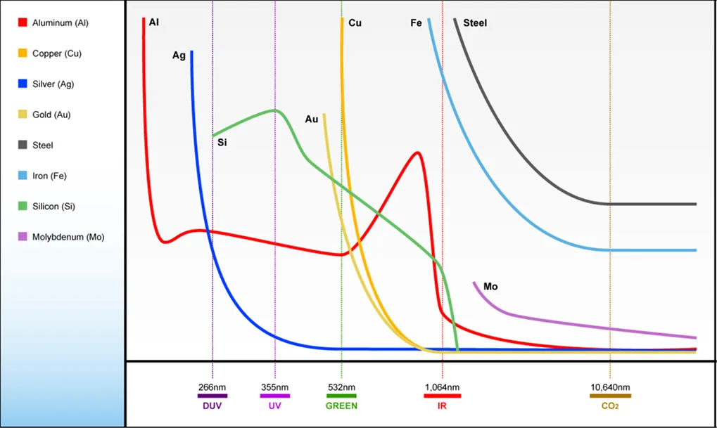 Разные лазеры имеют различную поглощаемость для каждого отдельного материала (график ниже). Также, оттенок при обработке материала зависит от мощности и скорости обработки.