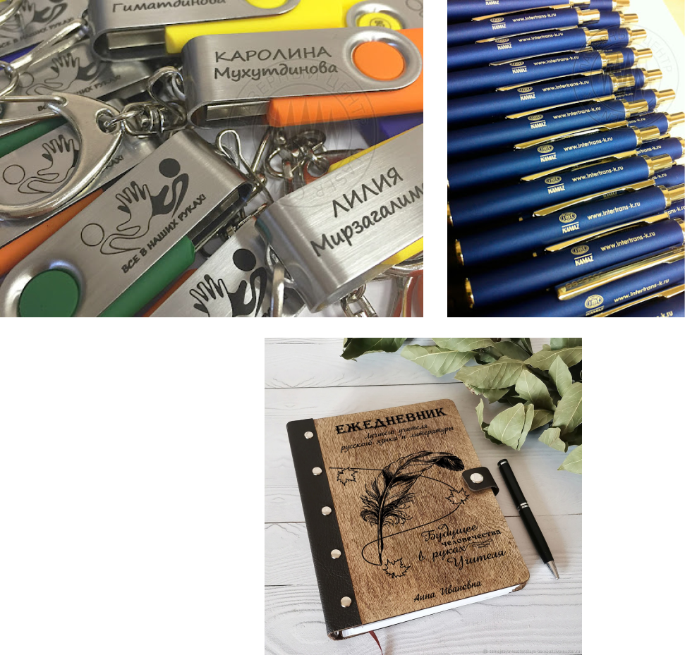 Лазерный маркировщик предоставляет широкие возможности по стилизации различных предметов. В первую очередь, это интересно для бизнеса по производству сувенирной продукции. Самое простое это нанесение бренда или логотипа компании на канцелярию (ручки, брелки, флешки, ежедневники и т.д.):