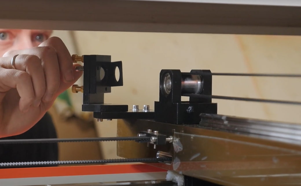 - Зеркало №2. Первую проверку проводят на ближней дистанции, чтобы избежать повреждения ремня. Настройка зеркала №2 аналогична №1: регулируют на разных расстояниях, проверяя попадание импульса. При мощности 12% разница между точками попадания будет заметнее. Для горизонтального смещения ослабьте винты и сдвиньте зеркало, не трогая крепления.