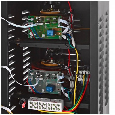 - Электромеханические имеют низкую погрешность, 3%, и плавную регулировку напряжения. Широкий диапазон регулировки, небольшие габариты и малая стоимость — плюсы этого стабилизатора. Но по сравнению с релейными у них меньшее быстродействие, ~50 миллисекунд, и хорошая слышимость ночью;