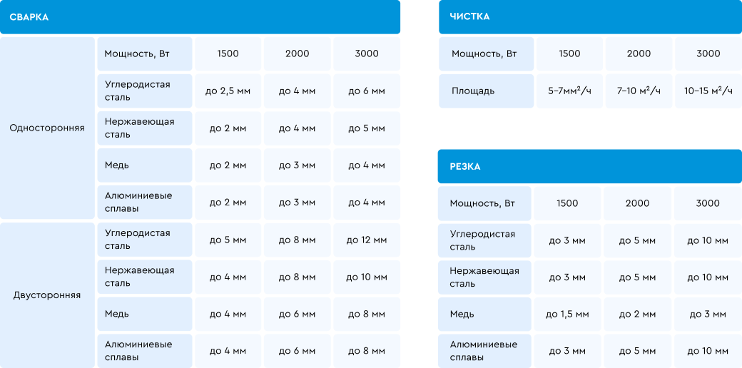 Помимо сварки, собрали данные по скорости лазерной резки и площади очистки металла лазером.