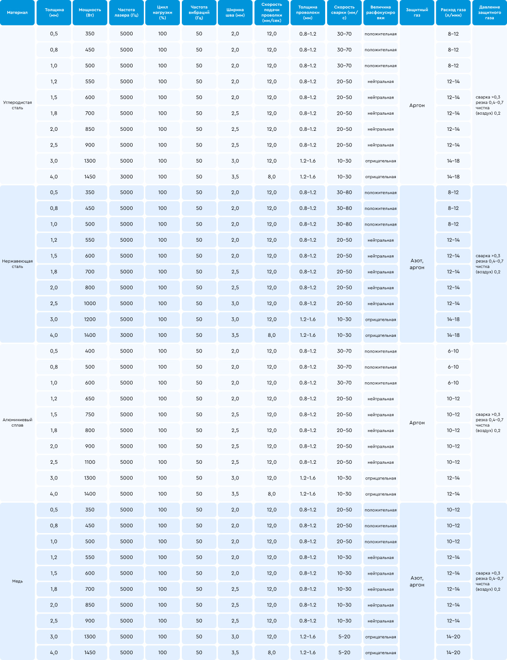 Таблица параметров лазерной сварки поможет подобрать настройки для работы с различными металлами.
