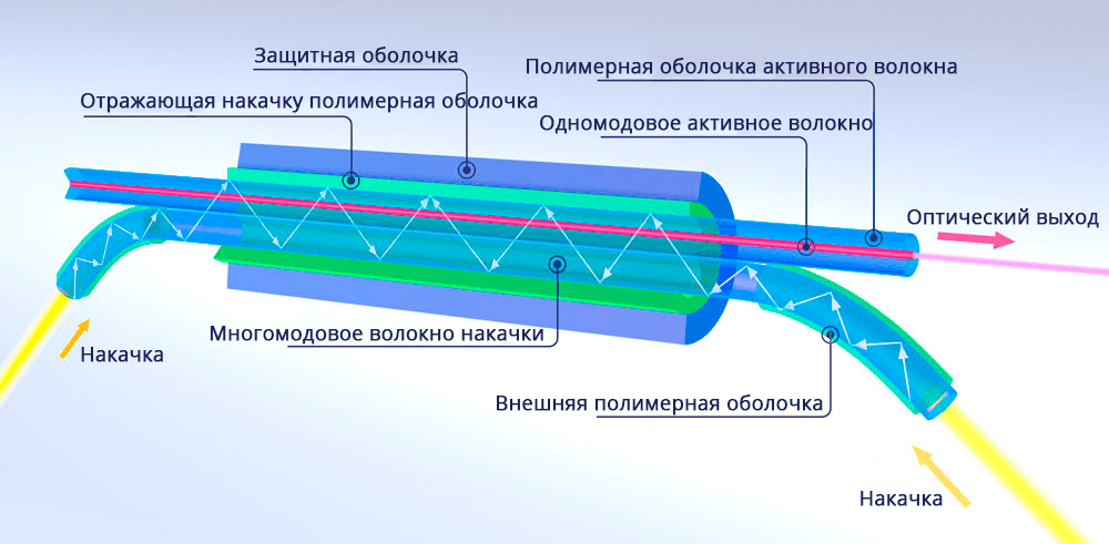 Он используется на основе оптически активного или кварцевого волокна, генерация излучения происходит непосредственно в волокне и уже оттуда поступает к месту обработки материала.