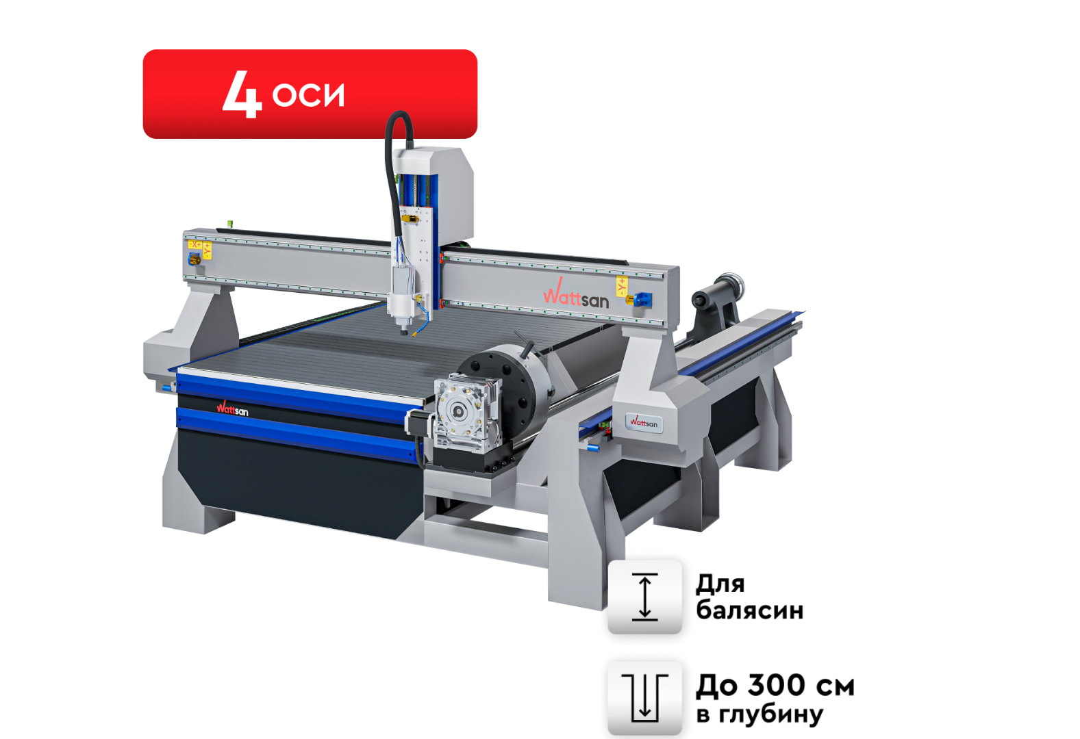 Четвертая ось — поворотное устройство для обработки балясин и других цилиндрических изделий. Данная особенность нашла место в деревообработке, в частности — в мебельном производстве.