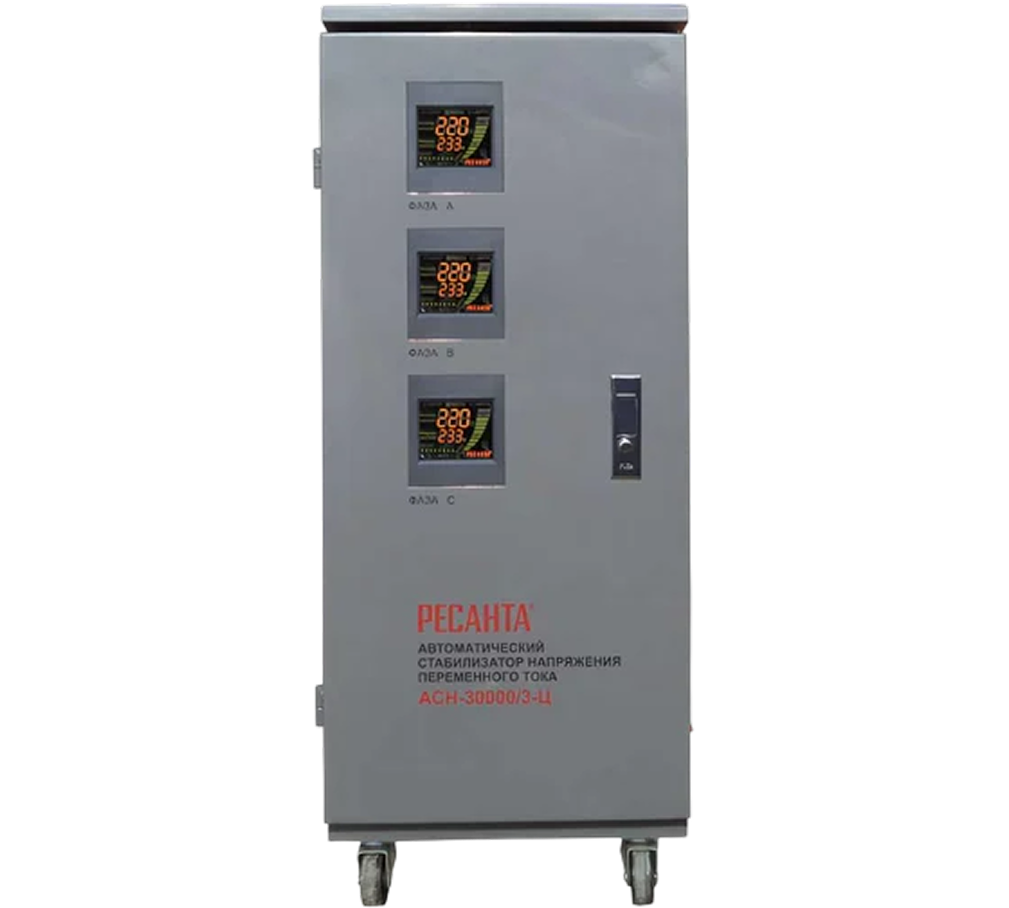 Стабилизатор напряжения Ресанта АСН 30000/1-Ц предназначен для выравнивания входного напряжения и защиты приборов от перепадов напряжения. Превышение пределов поддерживаемого входного напряжения автоматически отключает подачу питания.