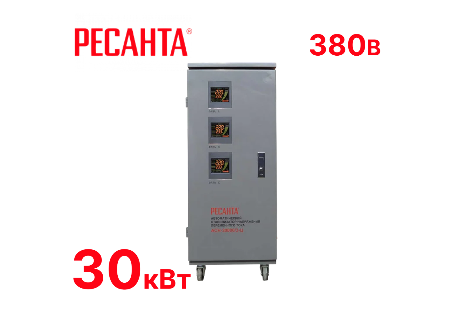 Стабилизатор Ресанта ACH-30000/1-Ц имеет мощность 30 кВт, данной мощности хватит, чтобы питать один или несколько потребителей, но суммарное потребление не должно превышать установленный мощностной номинал. Стабилизатор имеет защиту от короткого замыкания при помощи предохранителя. КПД аппарата составляет — 97 %.