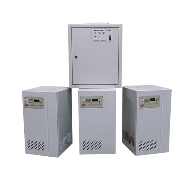 Стабилизатор напряжения состоит из трех напольных однофазных силовых блоков, настенного блока коммутации и комплекта кабелей для соединения всех блоков между собой.