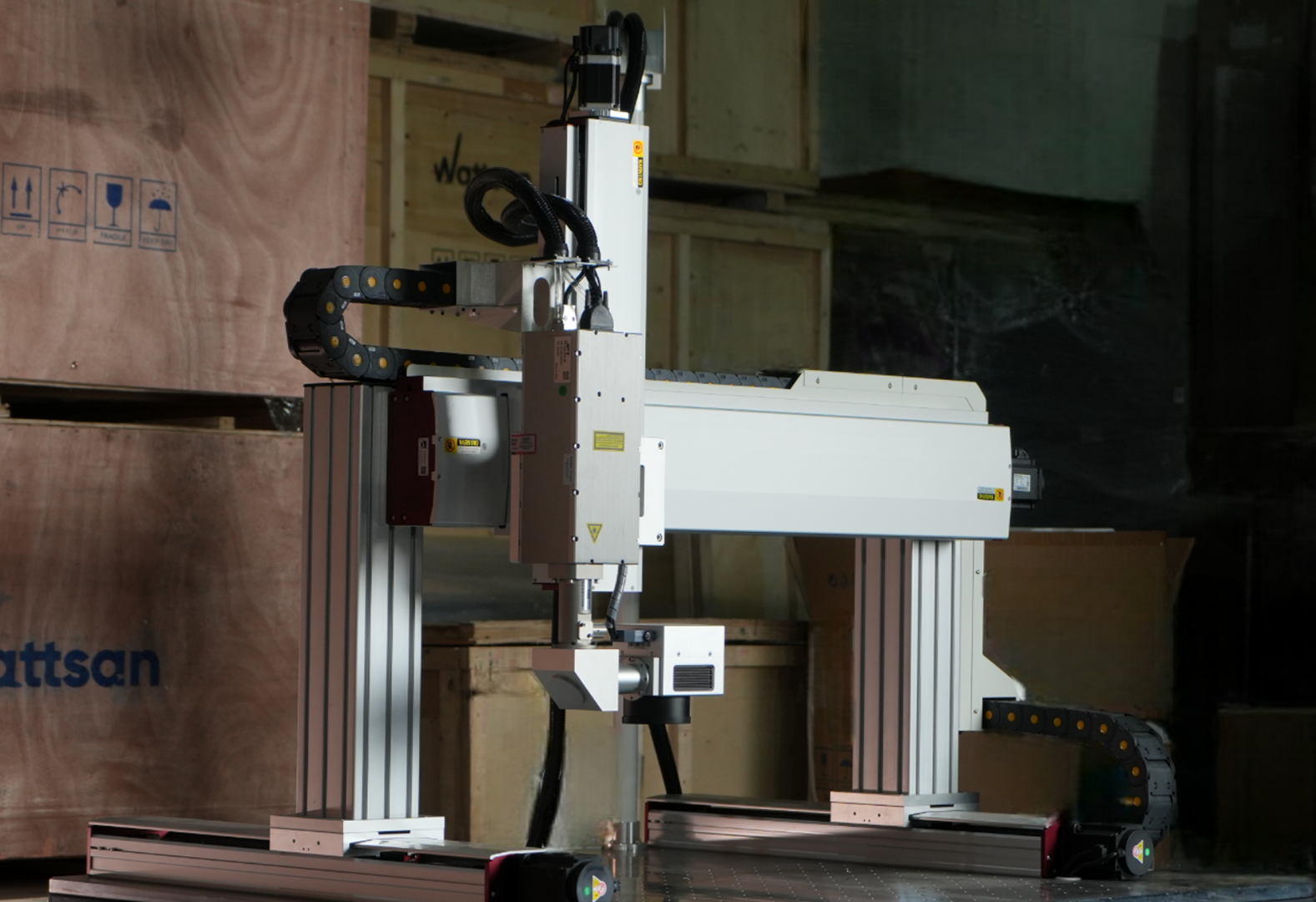 Лазерный маркер Wattsan RF GT (Gantry Type) — портальный маркер с RF-излучателем с неограниченной областью маркировки, благодаря модулям перемещения, на которых расположен сканатор, и системе управления Syntec Marking.