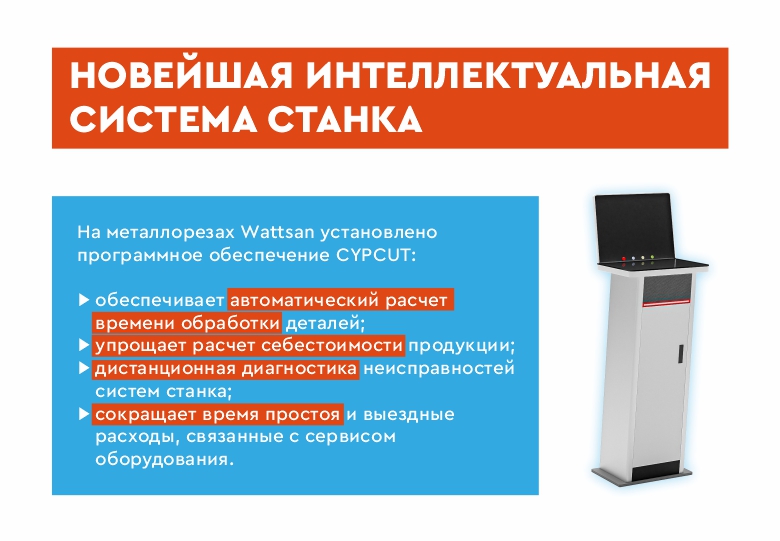 На металлорезах Wattsan установлена система управления FSCUT 2000E и старше. Она состоит из контроллеров и программного обеспечения CYPCUT.