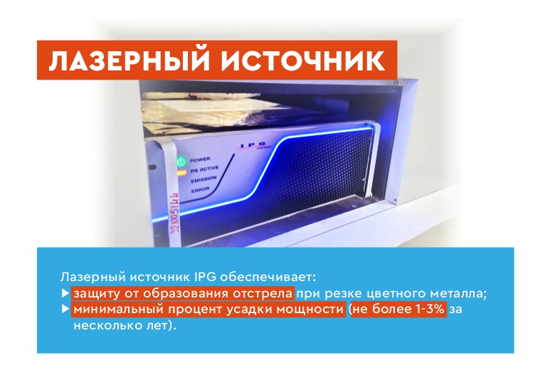 1) Ультра производительным излучателем премиального уровня VPG LaserONE (IPG, Россия). Для резки цветных металлов, черной и нержавеющей стали.