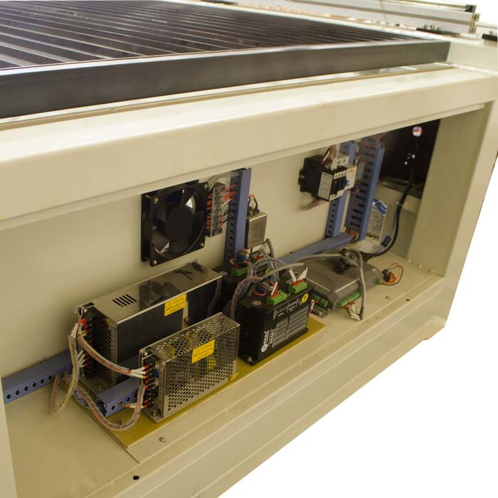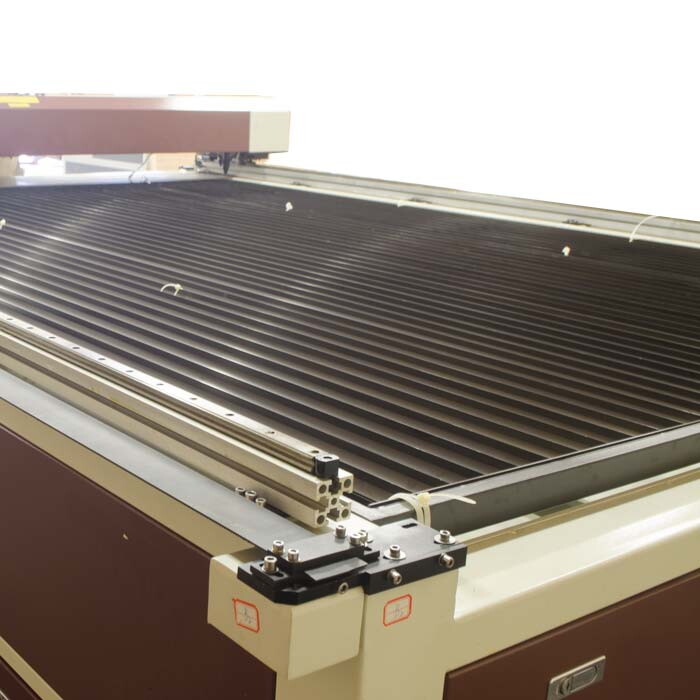 Рабочий стол имеет габариты 2000×3000 мм. Поверхность состоит из стальных ламелей, на которых располагают материалы для обработки. Сам стол открытого типа: портал располагается над поверхностью и перемещается полностью.