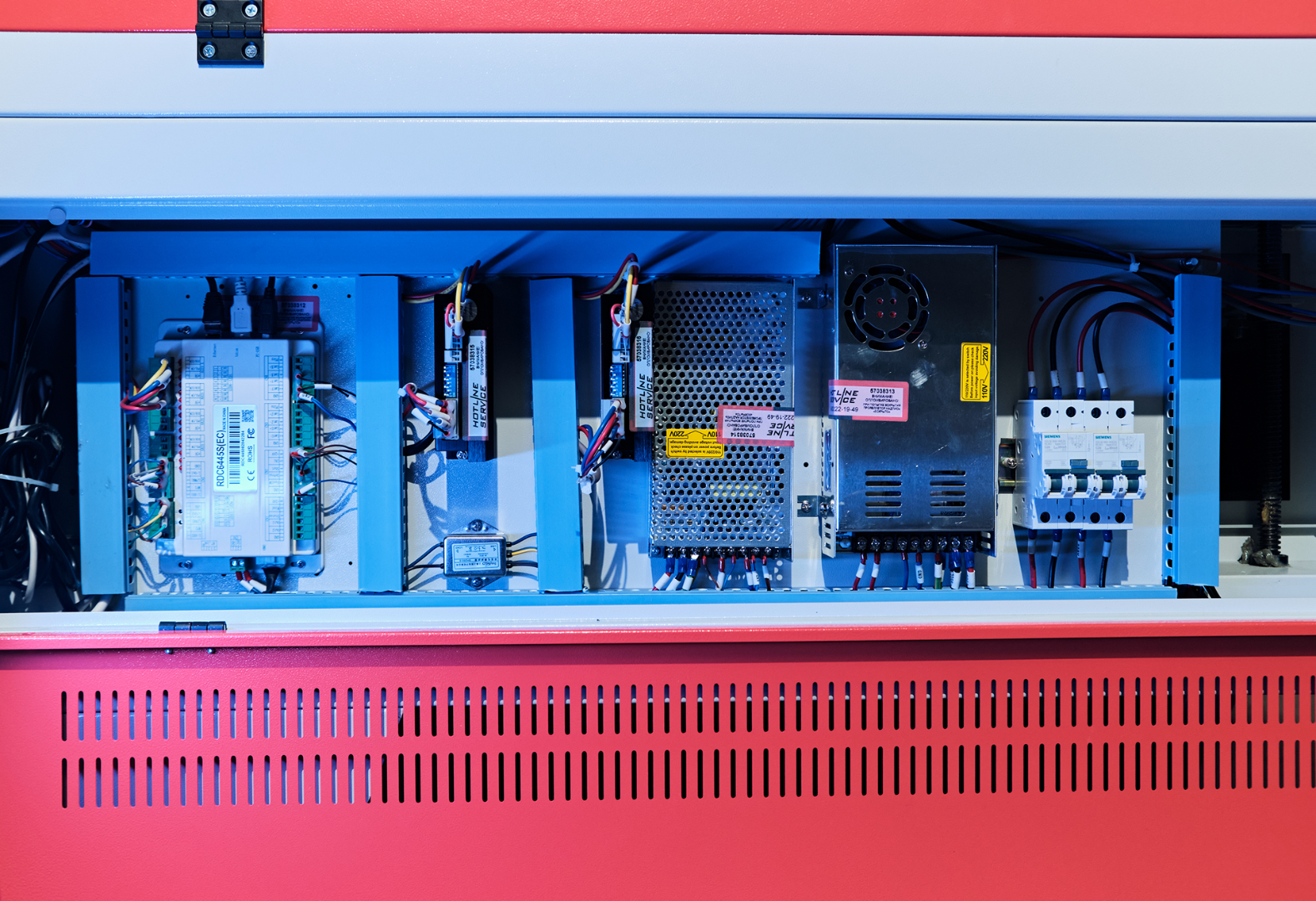 Мы специально заменили двухфазные шаговые двигатели на трехфазные. Это позволило уменьшить величину шага относительно аналогов и значительно увеличить качество гравировки, а также улучшить плавность хода, что особенно актуально при резке акрила и толстой фанеры.