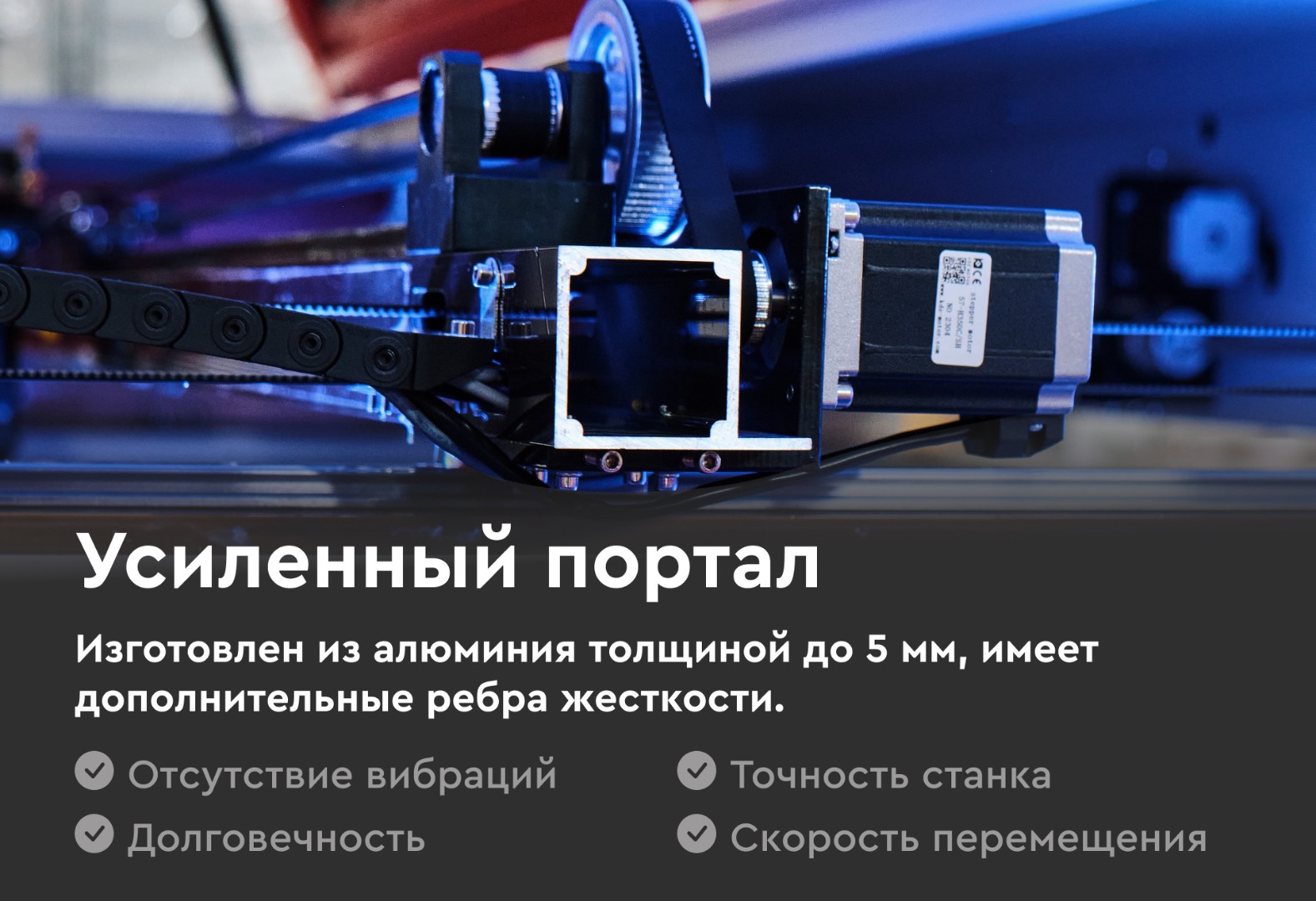 Как правило, данные двигатели служат у клиентов от трех лет и более, благодаря своей исключительной надежности.На станках установлены ременные редукторы 1/3. Редукторы снижают нагрузку на шаговые двигатели, добавляют плавность. Соотношение 1/3 гарантирует меньше брака и отсутствие пропуска шага.