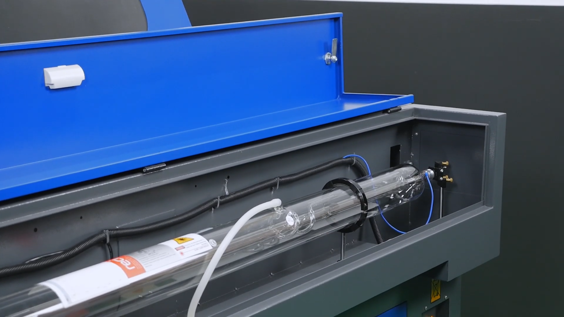Мы установили универсальные крепления для лазерной трубки, которые оборудованы регулировочным винтом и измерительной шкалой, что позволяет производить их быструю замену вне зависимости от диаметра/мощности трубки и оперативно осуществлять юстировку станка.