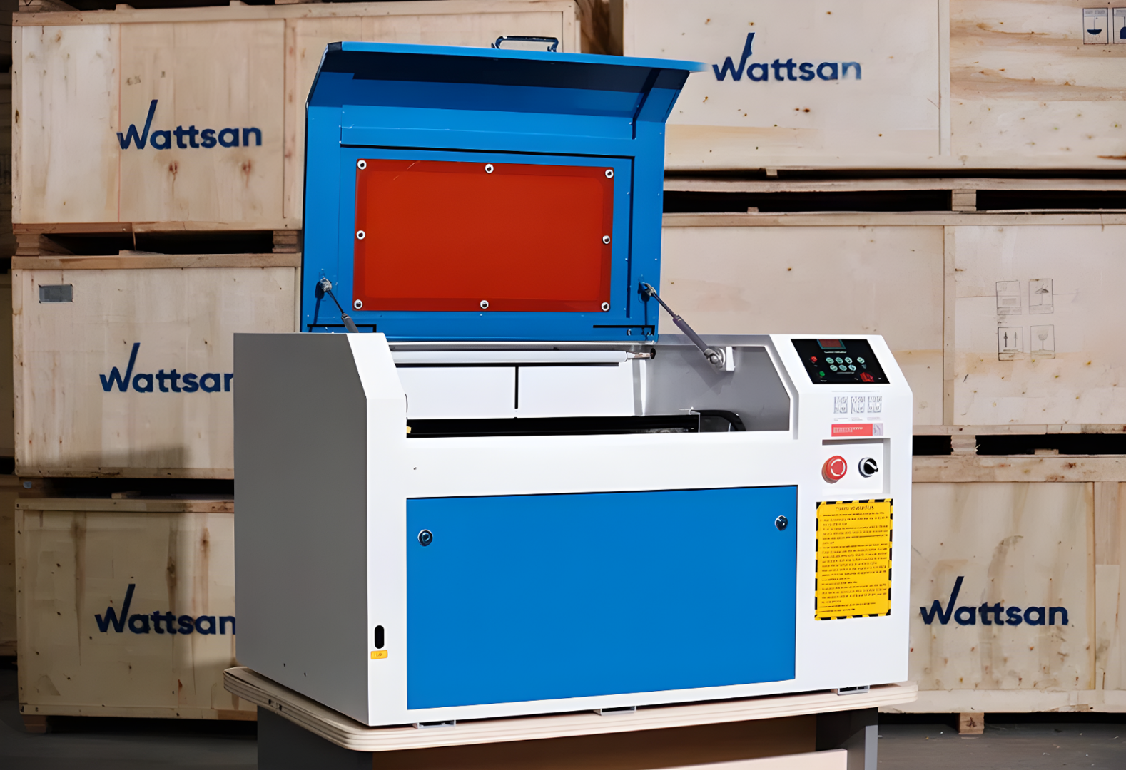 Советуем лазерный станок-гравер WATTSAN 0503. Он работает с любыми материалами (фанера, стекло, оргстекло) и как режет, так и гравирует. Единственный нюанс, если вы хотите гравировать именно бокалы, то вам нужно специальное поворотное устройство.