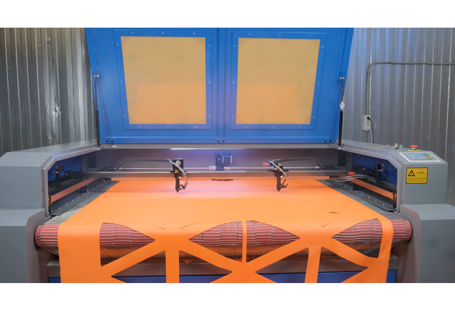 Покрытие стола выполнено из стальной сетки круглого сечения толщиной 2 мм. Поскольку раскрой ткани выполняется на малых мощностях, такое покрытие исключает отстрелы при работе.