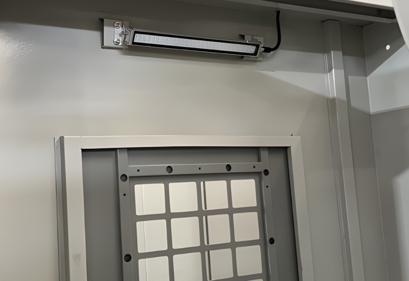 - Зона обработки освещена лампами по бокам.